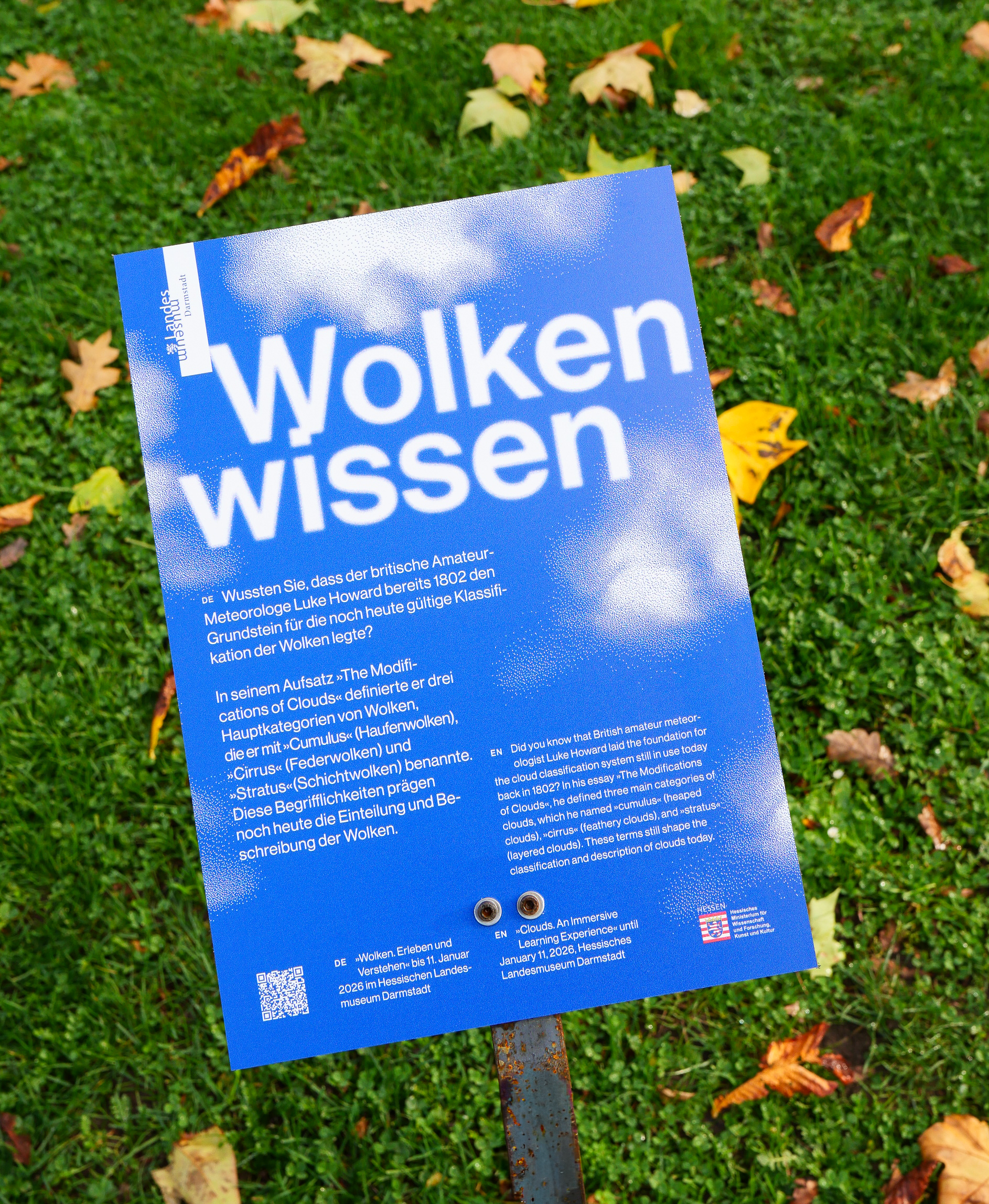 Das Hessische Landesmuseum Darmstadt möchte mit der Aktion dazu anregen, sich auch im Alltag mit den faszinierenden Wetterboten auseinanderzusetzen. Indem die Schilder in unmittelbarer Nähe zu Sitzbänken montiert wurden, laden sie dazu ein, innezuhalten und den Blick nach oben zu richten.